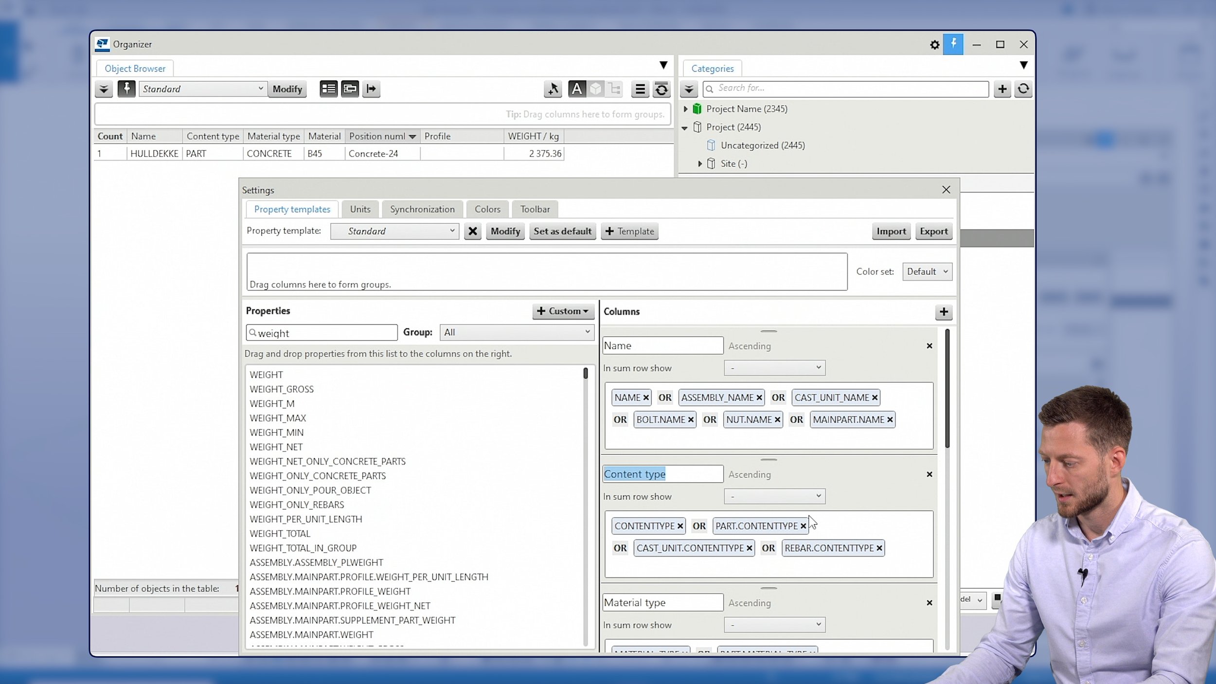 Another typical scenario is needing a report at short notice. We show how to use Organizer to generate a list of all steel plates in the model, grouped by profile or name, and export that directly to Excel.